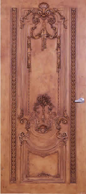 This ordinary flat panel door is made exraordinary by the application of J.P.Weaver polyester resin ornamentation and a subtle wood burl faux finish. |