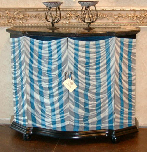 This once simple cabinet has hand-painted trompe l'oeil drapes and a faux marble top. This picture, taken in our showroom, also shows a gilded frieze from J.P. Weaver used as a chair-rail, and a subtle old-world fresco on the wall. |