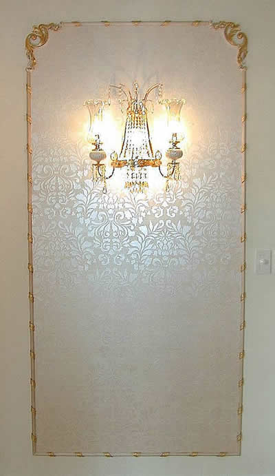 This panel shows the silk damask finish developed for a gold and white formal Louis XV dining room. The traditionally French reed and wrapped ribbon and french corner ornamentation was also designed, installed and gilded by K&P in an architectually correct manner. Note the different direction of the ribbon on the left and right sides of the panel. |
