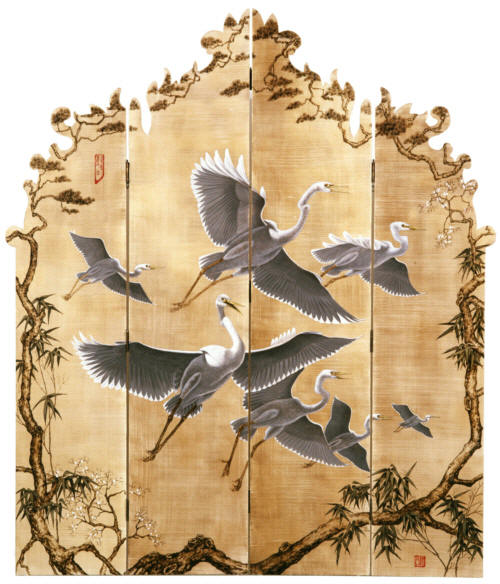 This hand-painted 6'x7' screen combines realistically painted cranes with a stylized Chinese border on a golden metallic faux finish that mimics the sheen and color variations of antique silk. |