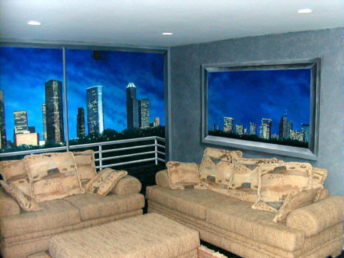 This second view of the Houston skyline media room shows the wall adjacent to the 8' x 17' mural. The faux finish on the wall matches the grey stucco on the wall at the left in the mural, and the client liked the effect of the mural so well that we added a "window" looking out at the Texas Medical Center. This portion of the mural was executed directly on the wall rather than on cambric cloth like the full-wall mural. |