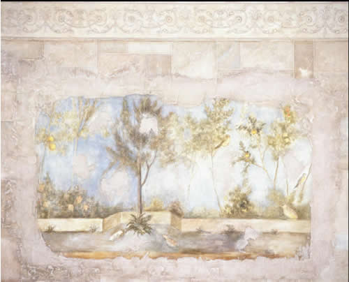 This faux fresco is in our showroom. It is based upon "Lena's Garden", a 2000 year old fresco uncovered in Pompeii. Although not a true fresco, it is a convincing faux -- and the stone block surrounding it has become one of our more popular finishes. as well. A large full-color photograph of this mural was featured in an article in Houston House & Home called "Plaster and Pigment" about fresco techniques.