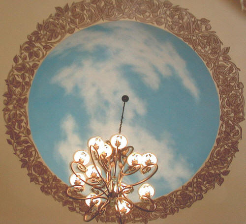 This 12' diameter dome was executed for the Bellaire New Home showcase on site (25 feet above the foyer floor). Both the clouds and the 12" border were hand painted (no stencils used). It created a dramatic focal point with the added benefit of camouflaging a less than perfect job of sheetrocking! |